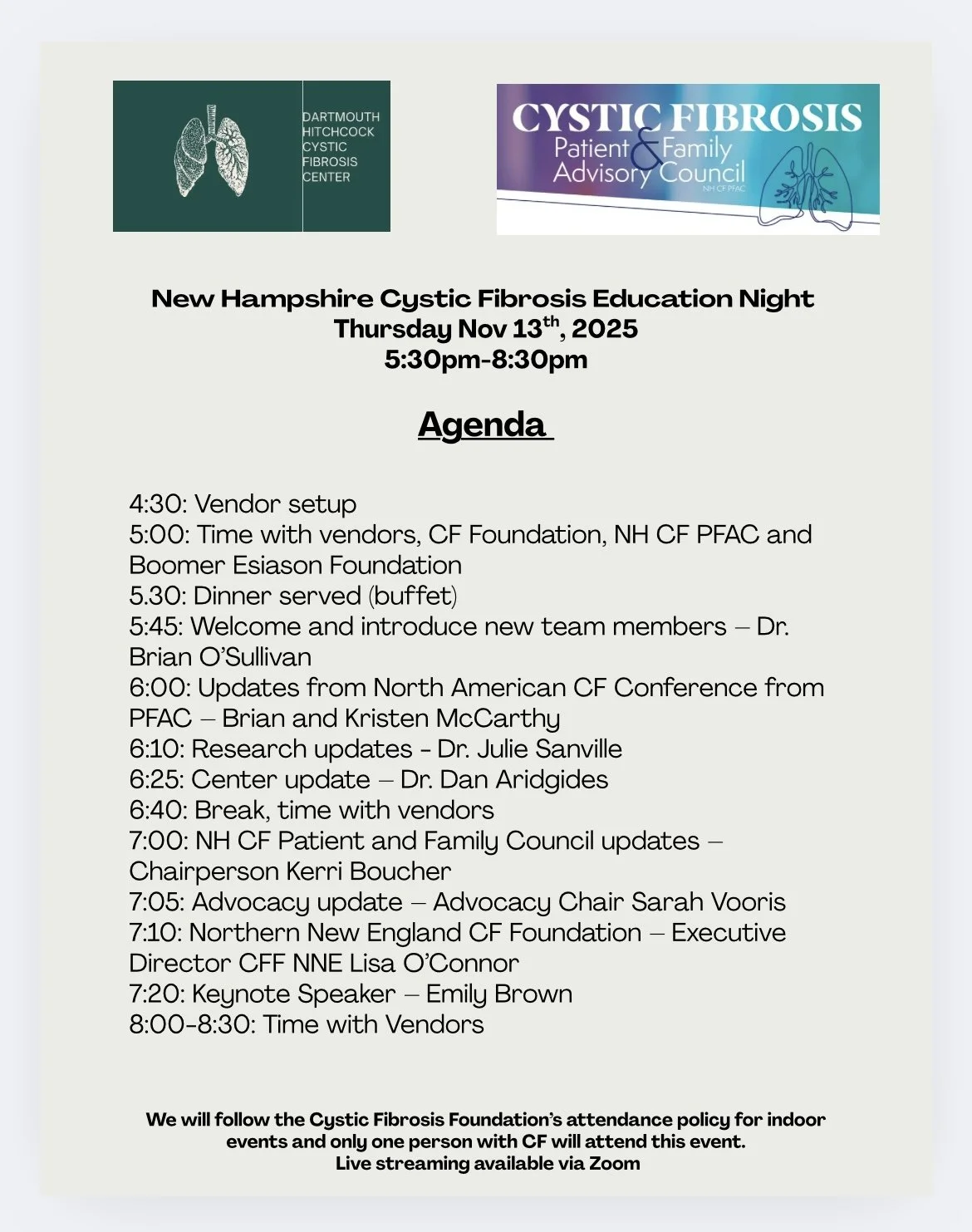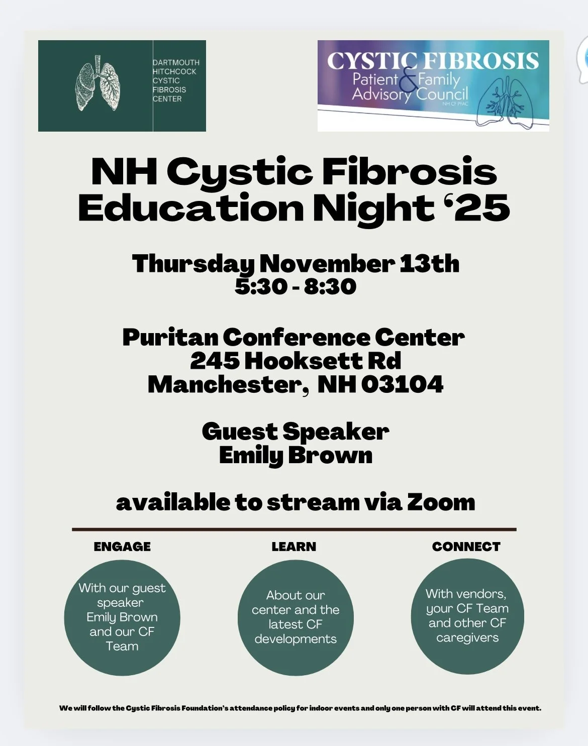 November 13th 2025Puritan Conference Center, ManchesterDirections Guest Speaker - Emily Brown NH Cystic Fibrosis Education Night 2025