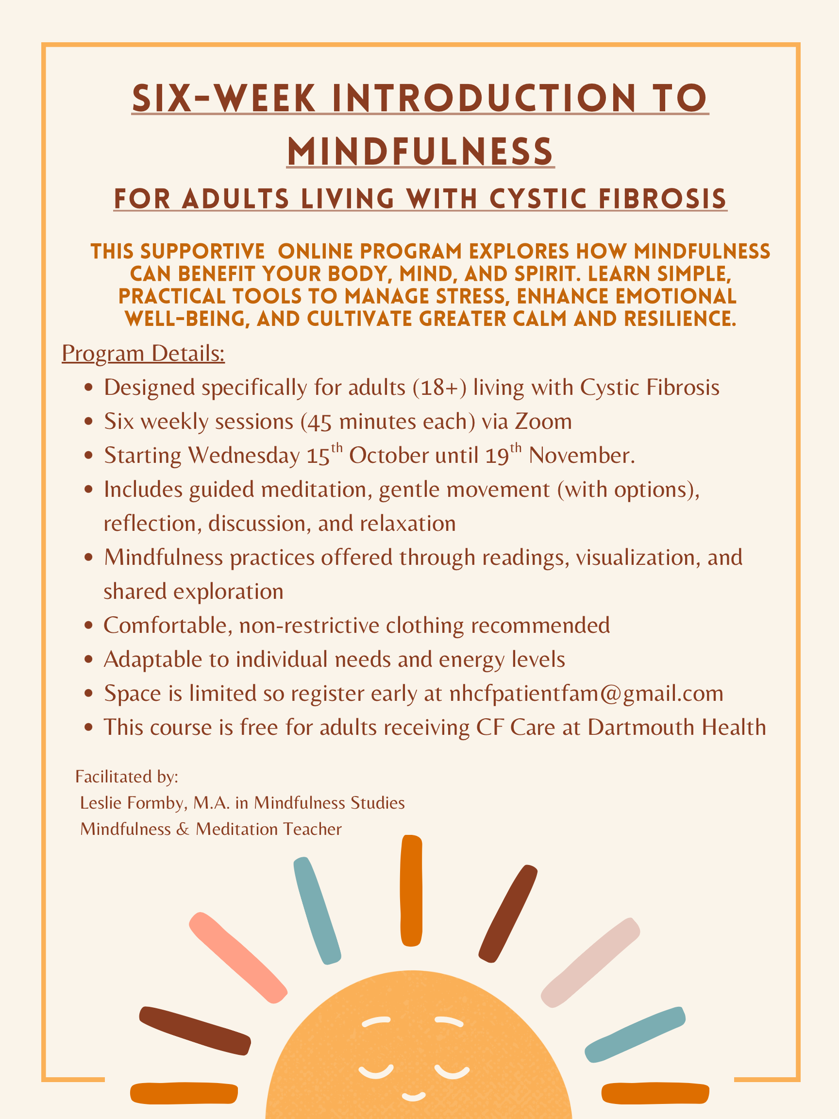 We are so excited to offer this Mindfulness Course (at no cost!) to Adults who receive CF care at Dartmouth Health.